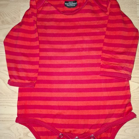 Made in Finland-body. Väriltään punainen-oranssi. Nimikoitu. Olka-haaramitta n.39cm. Hyväkuntoinen ja ehyt. Eläimetön ja savuton koti.