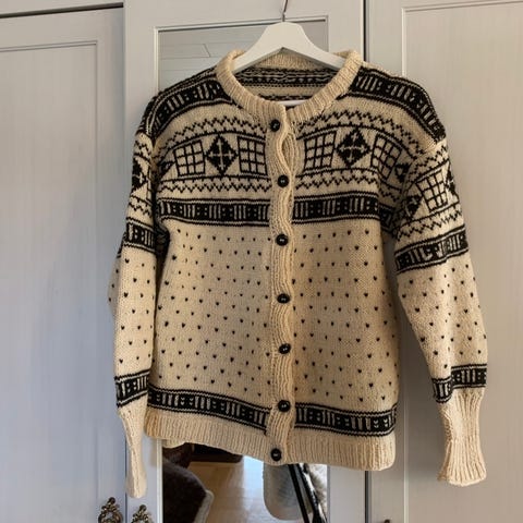 Musta/beige uudenveroinen , kerran pidetty norjalainen kuviollinen villatakki.