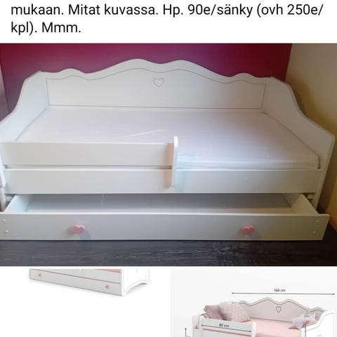 Koko 145x70 ja patja halutessaan mukaan. Löytyy myös peitto ja lakanoita.