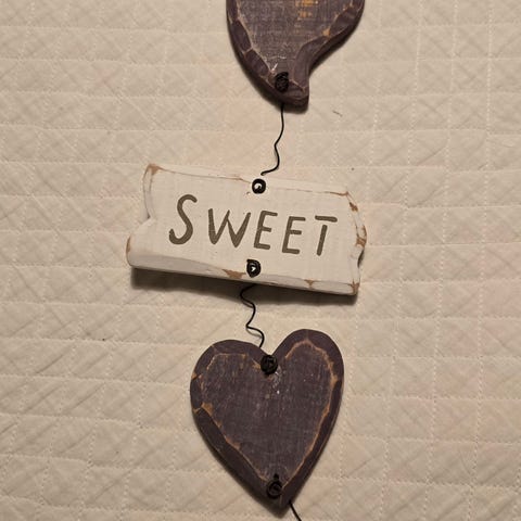 Puinen sydänmallinen koriste esine, muoviprisma ja juuttinaru. Hyvä kuntoinen. Nouto Malminkartano (Helsinki) tai postitus postimaksua vastaan.