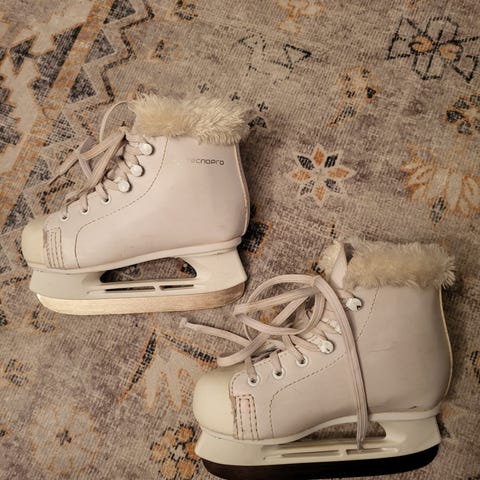 Vähällä käytöllä olleet luistimet koossa 28. Käytön jälkiä tosin löytyy ja aavistus ruostetta toisessa terässä.