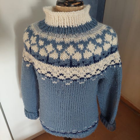 Kerran kokeiltu, itse neulottu. Lankana kutiamaton Sandnes garn duo. (merinoa ja puuvillaa) Mallin nimi ei muistissa. Ohje vanhasta käsityölehdestä. Mitat kai-kai 33cm, kai-helma 23cm,kai-hiha 27cm. Korotettu niska.