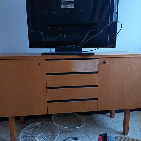 Kaksi avainta löytyy jotka käyvät kaikkiin oviin. Pieni jälkiä keskimmäisessä ovessa.