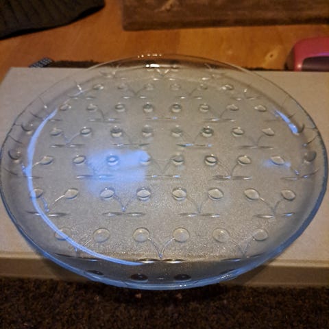 Nanny Stilin.Riihimäen lasille muotoilema 33 cm. halkaisijaltaan oleva tarjoilu lautanen. Ei ole ollut käytössä.