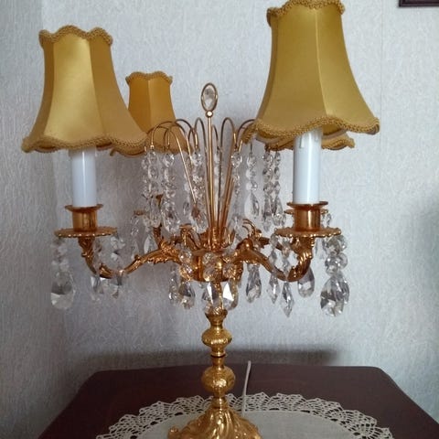 Rungon korkeus 39 cm ja valaisimien yläreunaan noin 44cm, kaunis pöytävalaisin, auringon osuessa kristalleihin tulee kauniit sateenkaaren värit seinään, kattoin tai lattiaan paikasta riippuen