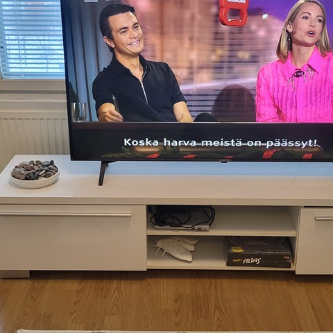 Korkeakiiltoinen TV-taso kahdella laatikostolla ja välitasolla. Valkoinen. Toisessa etukulmassa kuluma. Muuten kunto hyvä.