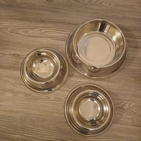 Valkoinen teline, metalliset kipot. Todella siistit. Toinen setti isompi, 10€ ja toinen pienempi, 7€.