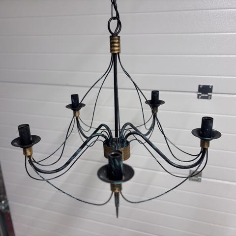 Antiikkivalkoinen metallinen kattokruunu 6 kpl E14 kanta lampuille 230V. Pahoittelut huonoista kuvista.