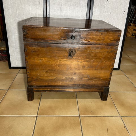 Myydään puinen arkku. Arkussa on pyörät joka helpottaa arkun siirtämistä. Arkussa on päädyissä kahvat. Edessä on solki. Arkussa on käytön jälkiä. Viimeisen kuvan laisku on kannessa.