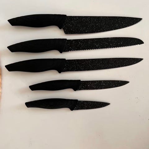 Myydään hyvässä kunnossa oleva keittiöveitsisetti. Sisältää viisi eri kokoista ja eri ruoalle tarkoitettua veistä. Silikoninen varsi.