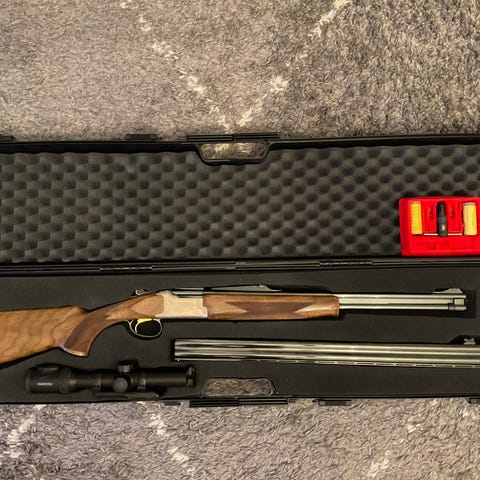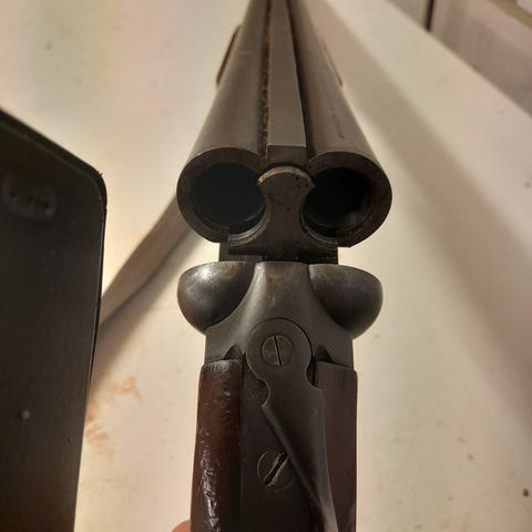 Hanallinen yhdistelmäase, lyhyt etutukki on alkuperäinen, aseessa kiinni tehty pitkä etutukki, joka