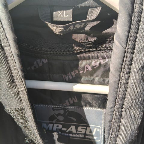 MP-takki, tuulen pitävä, kyynärsuojat. Koko XL, sininen ja musta väri, suunniteltu MP-ajoon. Takissa on useita taskuja ja säädettävä vyötärö, materiaali kestävää.