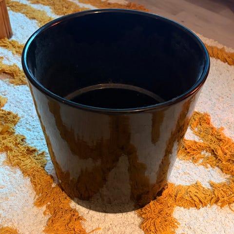 Koristeellinen kukkaruukku, harmaa väri mustalla koristekuvioiksi. halkaisija noin 24 cm. Sopii sisätiloihin kukkien ja kasvien istuttamiseen. Muutamia kolhuja/ jälkiä (kuvissa).