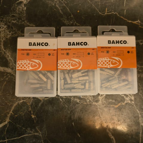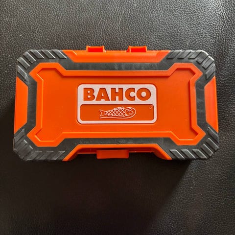 Korkealaatuinen Bahco ruuvauskärkisarja avaamattomassa myyntipakkauksessa. Hyvä kuminen kärkipidike jossa karbiidihaka vyökiinnitykselle.