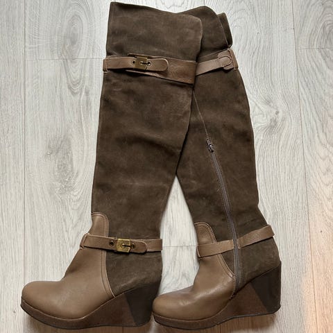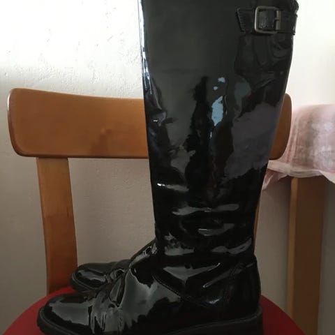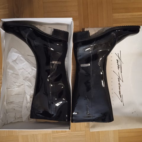 Uudet, käyttämättömät, omassa laatikossaan olleet Scholl- naisten lakerisaappaat. Koko pohjassa 41/42. Varren pituus ja päkiän leveys näkyy kuvissa.
