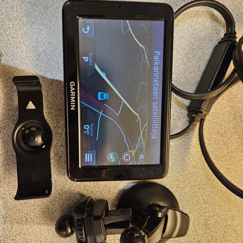 Garmin nüvi GPS-navigaattori sisältää kiinnikkeen ja virtalähteen. Laite on suunniteltu autonavigointiin ja siinä on näyttö, joka näkyy kuvassa. Mukana tulevat kiinnike ja virtajohto autokäyttöä varten.