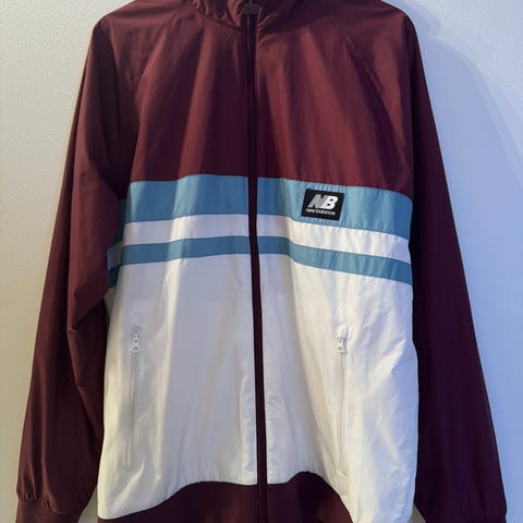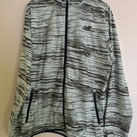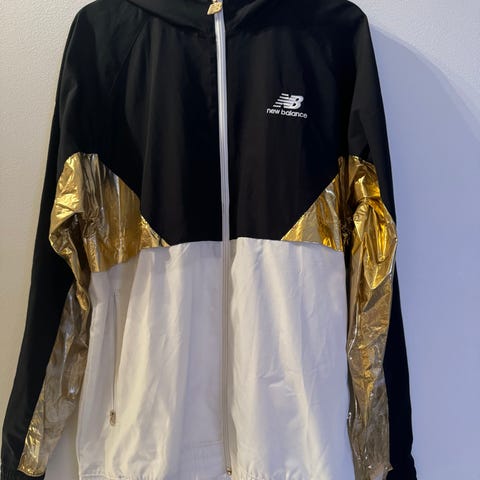 Musta juoksutakki/treenitakki/verryttelytakki. Kahisevaa kangasta. Oikeassa hihassa New Balance -teksti.