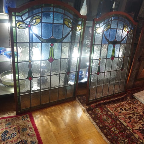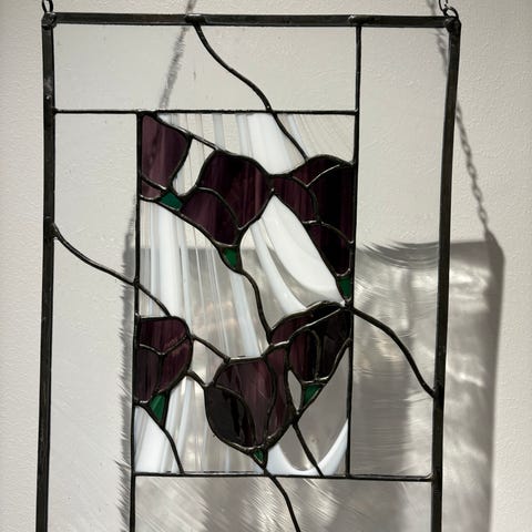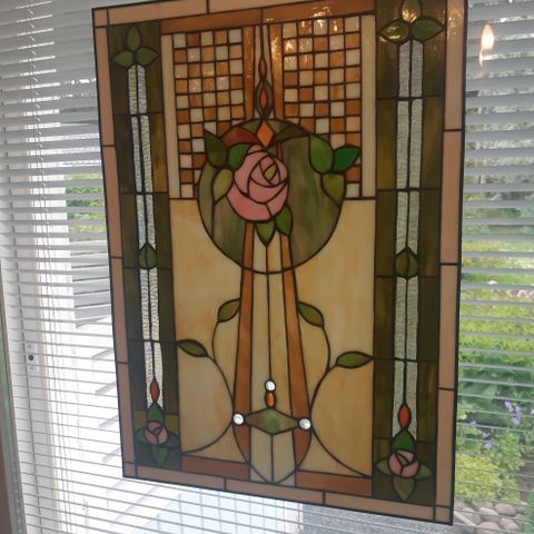 Koristeellinen lyijylasityö, jossa keskellä kukka-aihe. Reunustat ovat lyijylasityötä, keskellä oleva kukkakuvio ilmeisesti painokuva. Leveys n. 24 cm ja korkeus n. 34 cm.