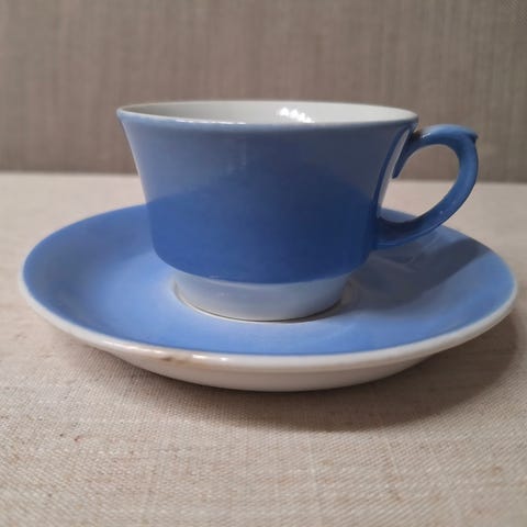 EP- malli. Vetoisuus 2,5dl ja jäi vähän vielä varaakin. Kupin korkeus n. 6cm ja suuaukon halkaisija n.9,5cm ja tassin halkaisija 16cm. Piippuleima 1932-49 ja kakkoslaadun leima. Kupin reunassa ja pohjarenkaassa ruskeaa. Kupin reunassa minikopsu ja kupin sisäreunaa kiertää tollanen viiru, näkyy kuvissa, siitä kenties kakkoslaatu. Käsittääkseni EP mallia on aika vähän teekuppina... Ei Toridiiliä. Nouto tai Matkahuollon lähetys.