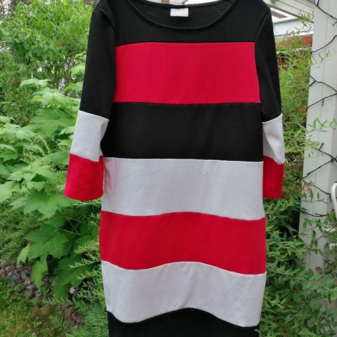 Joustava trikoomekko, 3/4 hihat. S kokoa mutta vastaa kokoa M. Pientä huomaamatonta nyppyä pinnassa osittain, saisi varmasti nypynpoistokoneella sileäksi. Yleisilme siisti.
