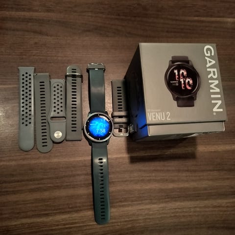 Hyvänkuntoinen Garmin Venu 2 kello. Näyttö virheetön, akku kestää viikon, kaikin puolin toimiva. Pientä kulumaa näkyy metalliosissa ja rannekkeessa kuten kuuluukin, mutta ei vaikuta toimintaan mitenkään.