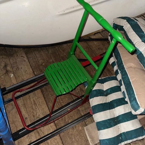 Lasten sininen potkukelkka, jossa kumiset liukujalakset. Korkeus n.70 cm.