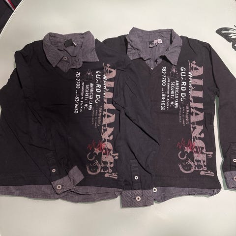 Siisti ja näyttävä paita, jossa kaulus- ja helmaosa näyttävät paidalta, mutta vaate on yksi kokonaisuus. Musta pohja, harmaa raidallinen kaulus ja hihansuut sekä iso printti edessä. Koko 110. Hyvä arkeen ja juhlaan, kun pitää näyttää pikkubossilta mutta ilman solmion kuristusta.
