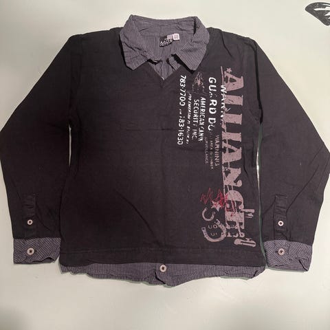 Täydellinen setti kaksosille: kaksi täysin samanlaista paitaa koossa 110. Musta pohja, harmaa raidallinen kaulus ja hihansuut, iso printti edessä. Molemmat ehjiä ja siistissä kunnossa. Täysin identtiset, joten kukaan ei pääse valittamaan “sillä on parempi paita”.