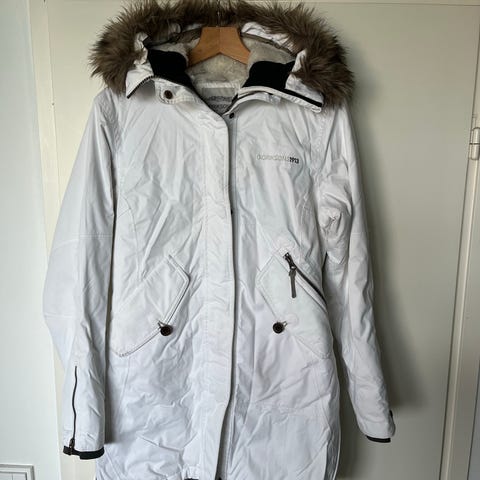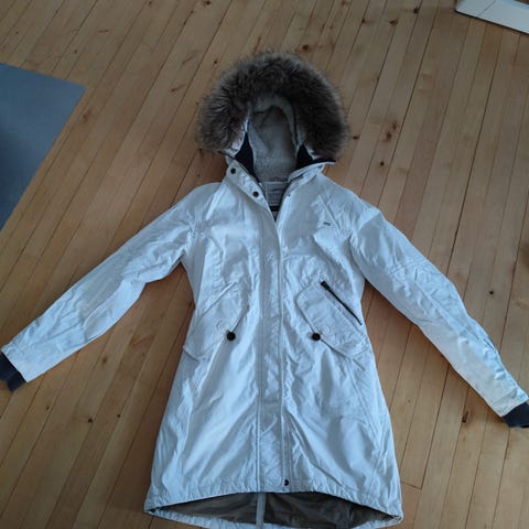 Lämmin vedenpitävä toppatakki. Ollut luottotakkina, mutta jäänyt omaan makuun liian pieneksi. Käytön jälkeä on, valkoinen väri jostain kohdista tummunut/likaantunut. Nämä pitäisi näkyä kuvista.