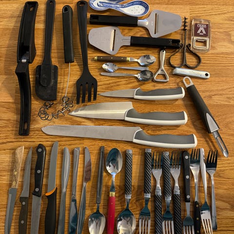 Keittiövälineet ja tarvikkeet sisältäen mm. 4 kpl lasinalusia (uudet), sitruspuristin (uusi), metallipillejä (uusi), pullonavaaja 2 kpl, patavahti, kissa (uusi), kahvimitta, teesiivilä, margariinirasian kansi/veitsi, kahvimitta, leikkuri.