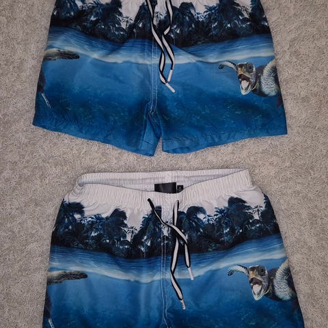 Molo värikkäät uimashortsit, koko 134/140. Materiaalina 100% polyesteriä kierrätetyistä muovipulloista, vuori 95% nylonia ja 5% elastaania.