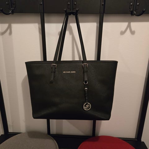 Myydään klassinen Michael Kors Jet Set Travel nahkainen käsilaukku, tummansininen kultaisin helyin. Laukussa on vetoketjullinen yläosa sekä tukevat kahvat, joten laukkua voi kantaa olalla tai kädessä. Sisällä on viisi taskua, joista yksi on pehmustettu vetoketjullinen läppäritasku, sekä avaimenpidike. Ulkopuolella ole käytönjälkiä, eli erinomaisen hyvässä kunnossa. Hihnoissa ei moitteita, katso kuvat.