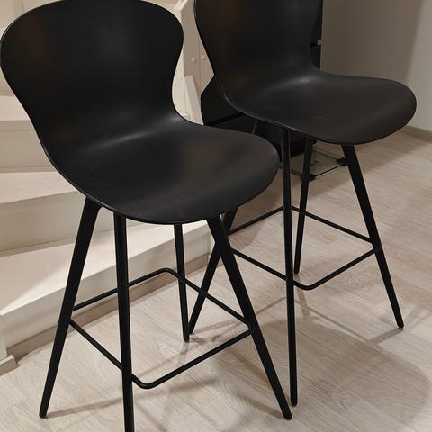 Kaksi kappaletta hyväkuntoisia baarijakkaroita tarjolla uuteen kotiin. Valkoinen runko ja selkänoja, vaalean harmaa istuinkangas. Molemmissa tuoleissa kuvassa näkyvät kulumajäljet runko-osassa sekä toisessa pieni jälki selkänojassa.