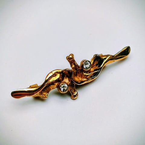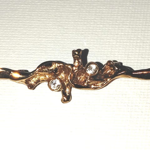 Todella vanha rintaneula, tukeva, halkaisija 6cm, pronssia (2 vikaa kuvaa ennen kiillotusta). Suunnittelija Anna Sigfrid, Tillander (1938-1945 valmistettu)