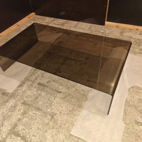 Pohjanmaan Kalusteen siisti valkoinen sohvapöytä, jossa lasipinta.