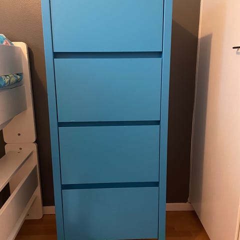 Säilytyskaappi ja työpöytä. Säilytyskaapissa on useita laatikoita ja ovellinen säilytystila, väri sininen. Työpöytä on valkoinen, jossa siniset jalat ja laatikosto. Kalusteet soveltuvat esimerkiksi työ- tai opiskelukäyttöön.