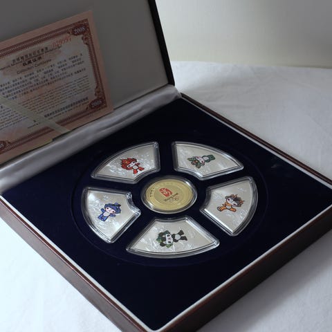 Pekingin 2008 Olympialaiset muistoesine, jossa on kultainen kehys. Mukana alkuperäinen laatikko ja sertifikaatti. Sisältää olympialaisten maskottihahmot ja tekstit "One World One Dream" ja "Beijing 2008". Muistoesine on setifioitu omalla numerollaan.