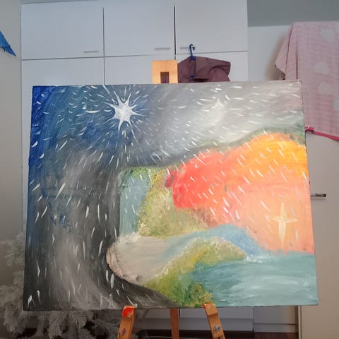Hei🙂Olen itseoppinut taiteilija Kouvolasta ja myyn edullisesti muutamia tekemiäni maalauksia. Nämä sopivat hyvin lahjaksi tai ihan omaksi iloksi. Maalaus kertoo uudesta huomisesta ja sen tuomasta toivosta. Taulun koko on 100x81 cm. Hp. 220. Sijaitsee Kouvolan Vahterossa.