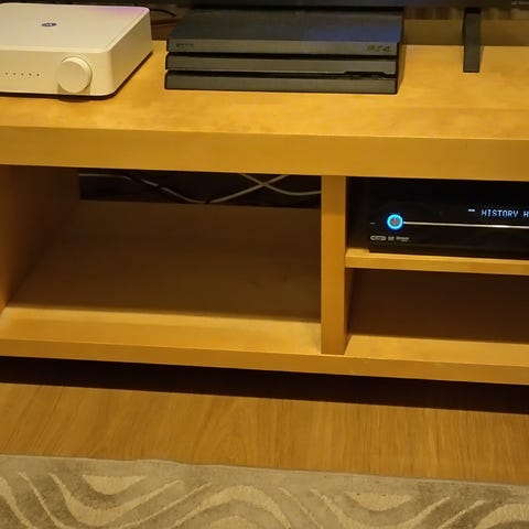 Metallista ja massiivipuusta valmistetussa rustiikkisessa tv-tasossa on avoin takaosa, joten johtojen ja kaapeleiden järjestäminen on helppoa.