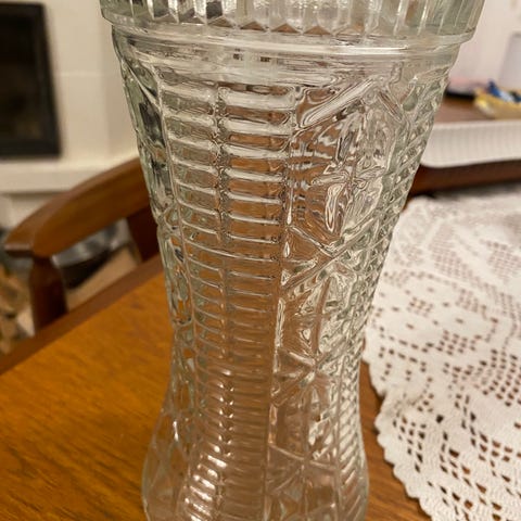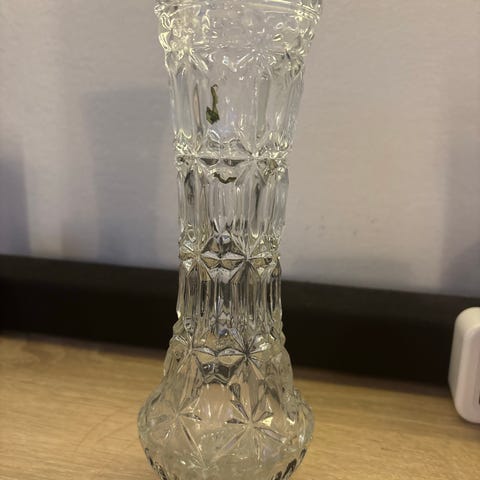 Kaunis vintage maljakko puristelasia. Pienen pientä kolhua huomasin maljakon yläosassa. Ikäänsä nähden kuitenkin oikein hyväkuntoinen. Korkeus 25,2cm ja suuaukon halkaisija 8,9cm.