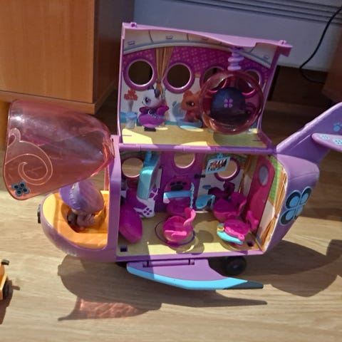 LPS-lentokone, toinen takasiipi kadonnut. Muuten siisti, mutta katossa hiukan tarran jälkiä. Tarvikkeet ja lentäjä mukaan.