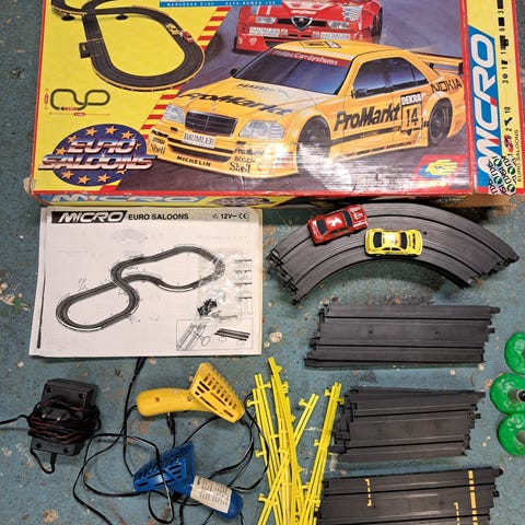 Muutaman kerran ajettu hyvässä kunnossa oleva Scalextric autorata hyväkuntoisilla ja täysin ehjillä formuloilla.