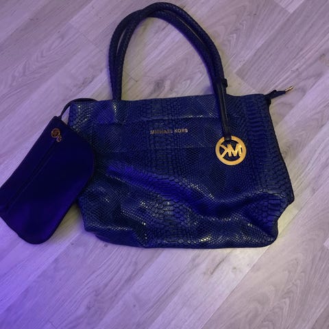 Michael Kors nahkainen laukku naisille, musta väri, nahkamateriaali. Laukun pinta on kuvioitu käärmeen nahkaa muistuttavalla tekstuurilla. Sisäpuolella on vetoketjullisia taskuja.