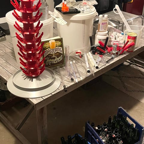 Käymissäiliö 20L, kruunukorkituslaite, 100kpl kruunukorkkeja, lämpömittari ja ominaispainomittari. Nouto.