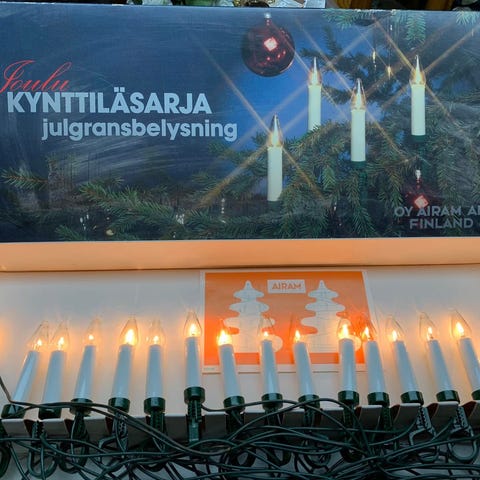 Airam vintage 10 kappaleen kynttiläsarja kuuseen tai ikkunakoristeeksi. Toimivuus testattu. Sarjassa valkoisia kynttilöitä, joissa on johdot ja pistoke sisäkäyttöön ei-maadoitettuun sähköiseen kytkentään. Nouto tai postitus ok.