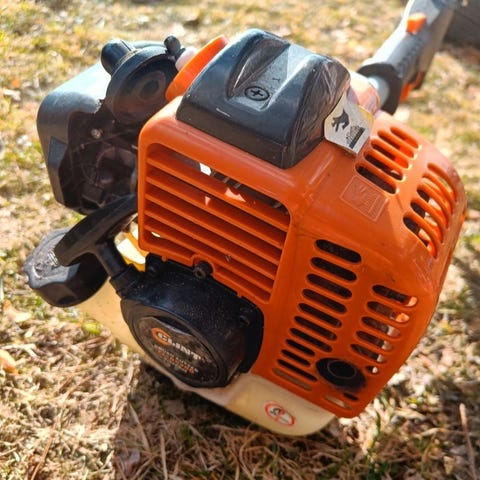 Hyundai- merkkinen raivaussaha-trimmeri, 2-tahtikone. Ostettu noun 10 v sitten käytettynä uudenveroisena, käytetty mäkillä vuodittain 2-4 tuntia, kesällä toimi mutta talvisäilöön laitossa ei käynnistynyt. Kuvissa mukaan löytyi muusta kohteesta kolmioterä ja metsäterä, ja kuvissa olevissa oransseista ruohoteristä toinen on vakiovaruste ja toinen extra. Mukaan tulee kuvan varusteet ja lisäksi vaatimaton mutta riittävä valjaat. Ja trimmmerilankaa myös.