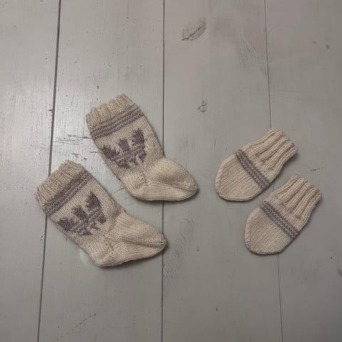 Ihan uutena meille tulleet vauvan tumput ja sukat. Ei ihan pienelle vauvalle, ehkä puolen vuoden ikäiselle ja vuoden ikäiselle vaunuun unille. Ei käytetyt,ovat edelleen tekijän langalla toisissaan kiinni. Ihana yksityiskohta lilat sydän kuviot varsissa