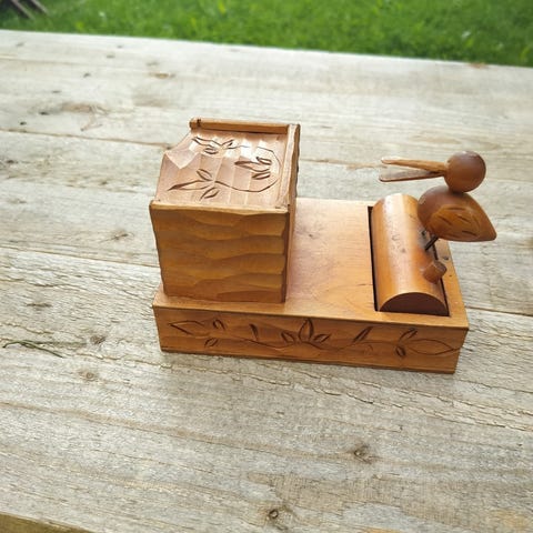 Myynnissä kuvan vintage puinen tupakkarasia. Rasiassa ollut myös soittomekanismi, mutta se ei toimi.