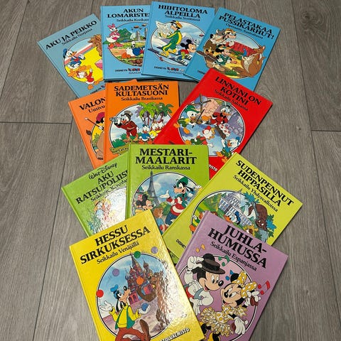 Kokoelma lastenkirjoja ja sarjakuvia, sisältäen muun muassa Disney-sarjakuvia, satuja ja oppimateriaaleja. Kirjat ovat eri kokoisia ja sisältävät värillisiä kuvituksia. Kaikki siistejä ja sivut tallella. "Parhaat sarjat" - kirjasta kulma vähän kärsinyt. Nouto pukinmäestä tai toridiili