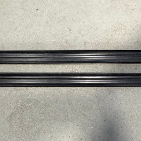 Thulen kattotelineiden alumiiniset putket. Pituus ilman muovisia päätyjä 108cm. Päätyosat kuvien mukaiset. Mukana seuraa myös toisen telineen T-uran suojakumi joka jäi pois kuvanottohetkellä. Vain nouto tai kulkeutuu myös Imatra/Lappeenranta toisinaan.